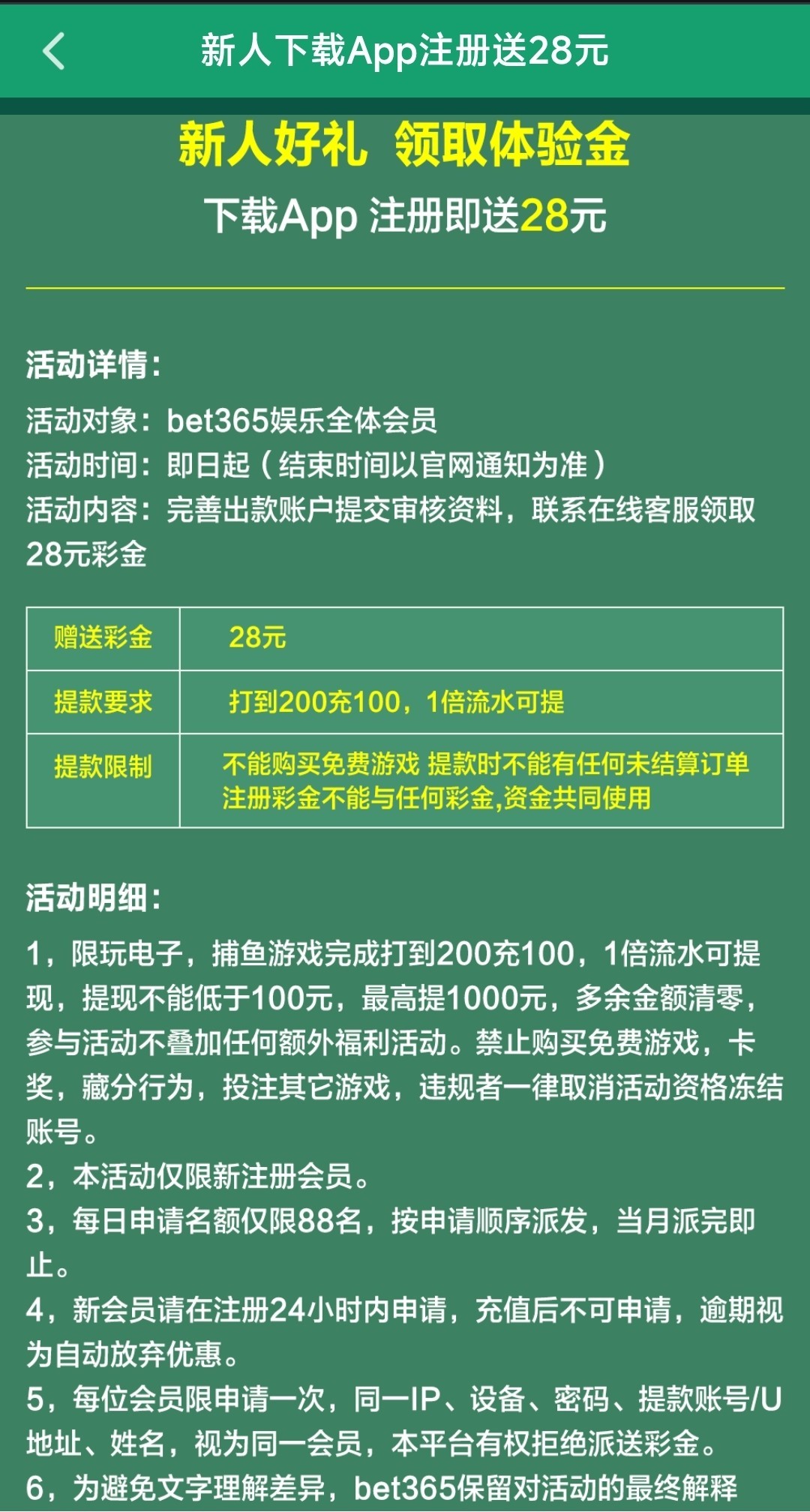 每日仅限88名,注册完善资料绑定出款账户联系客服领取,仅限娱乐“电子/捕鱼”,注册彩金不能与其他彩金/资金共同使用,打到200需要充值100后打码一倍流水最低提款100最高1000,不能购买免费一下,黑不黑自测!